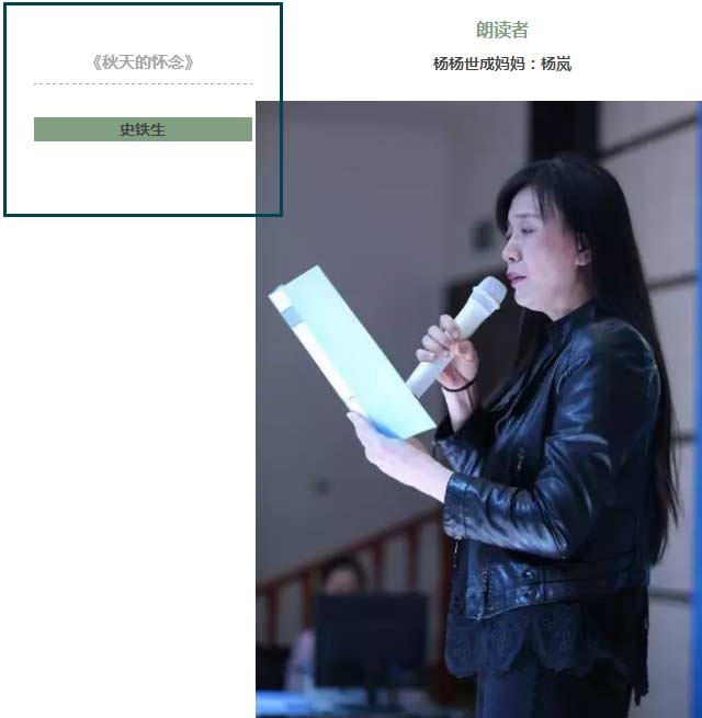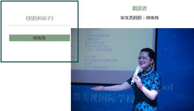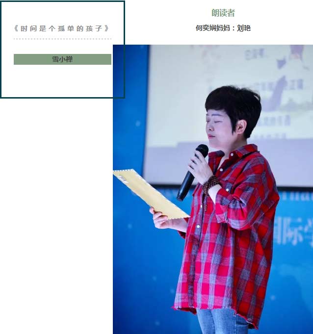 《時(shí)間是個(gè)孤單的孩子》,何媽媽字正腔圓、情真意切的朗讀讓會(huì)場(chǎng)迅速充滿了濃濃的文藝氣息。