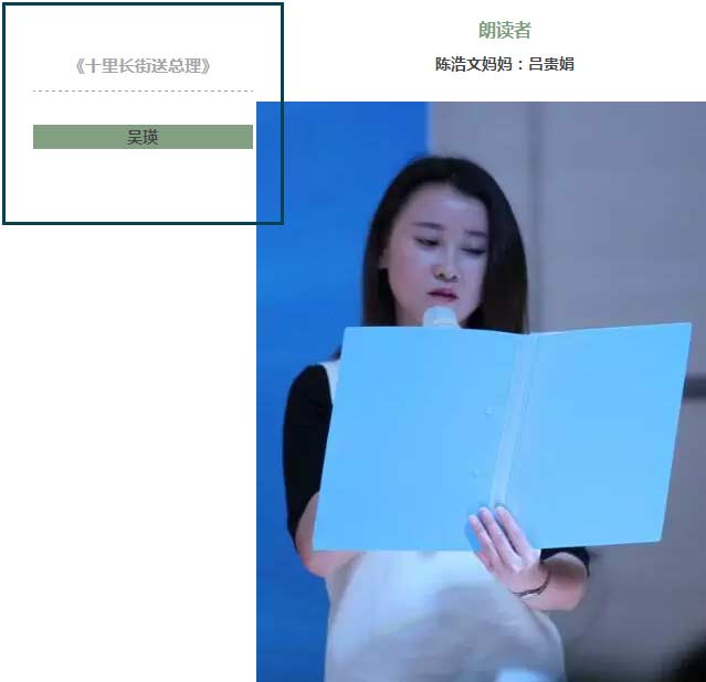 吳瑛1977年發(fā)表的《十里長(zhǎng)街送總理》曾經(jīng)是人們耳熟能詳?shù)淖髌罚彩蔷拺丫瞎M瘁的周總理的佳作,陳媽媽選擇這篇文章,就是希望孩子們不要忘記歷史,也希望自己的孩子能成為一個(gè)有用的人、一個(gè)對(duì)社會(huì)有貢獻(xiàn)的人、一個(gè)能推動(dòng)社會(huì)發(fā)展的人。