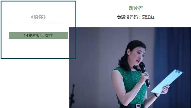 黃瀟漢媽媽葛江虹作為本期最后一位朗讀者,將這封信獻(xiàn)給全場(chǎng)所有人,也希望所有孩子都能在心里給自己的未來(lái)畫(huà)上一幅美麗的藍(lán)圖。