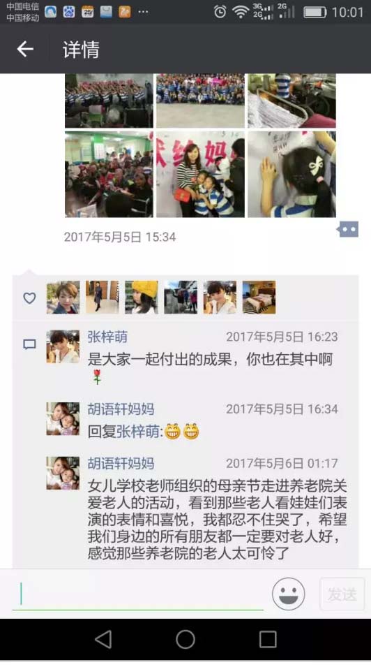 學(xué)生胡語軒的媽媽在朋友圈里寫到:“女兒學(xué)校老師組織的母親節(jié)走進(jìn)養(yǎng)老院關(guān)心老人的活動(dòng)太好了!寶貝們都表現(xiàn)得非常出色!看到老人們看孩子們表演時(shí)喜悅表請(qǐng),我忍不住哭了。希望我們身邊的所有朋友都一定要對(duì)老人好……謝謝寶貝送的母親節(jié)禮物!”