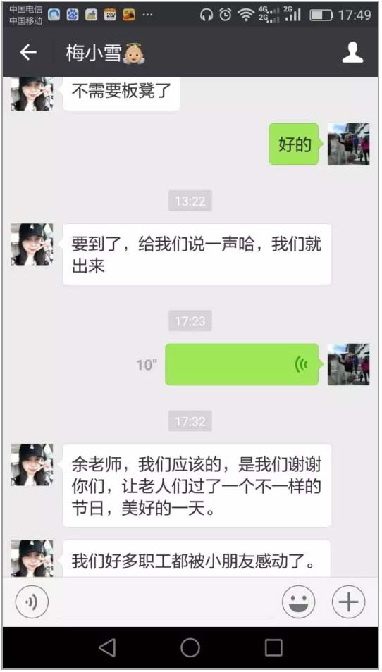 六醫(yī)院工會(huì)的梅雪老師發(fā)微信給二·一班的班主任說到:“余老師,我們的好多職工都被小朋友感動(dòng)了。謝謝你們讓老人們過了一個(gè)不一樣的節(jié)日,度過了美好的一天。”