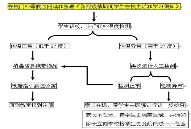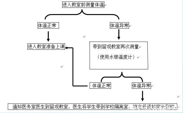 1、班主任于下午上課前對(duì)學(xué)生進(jìn)行體溫測(cè)量發(fā)現(xiàn)異常情況(兩次測(cè)量均超過(guò)37°),立刻將學(xué)生帶到留觀教室(初中樓109,高中樓101),并撥打應(yīng)急辦公室電話(85330878)告知情況。