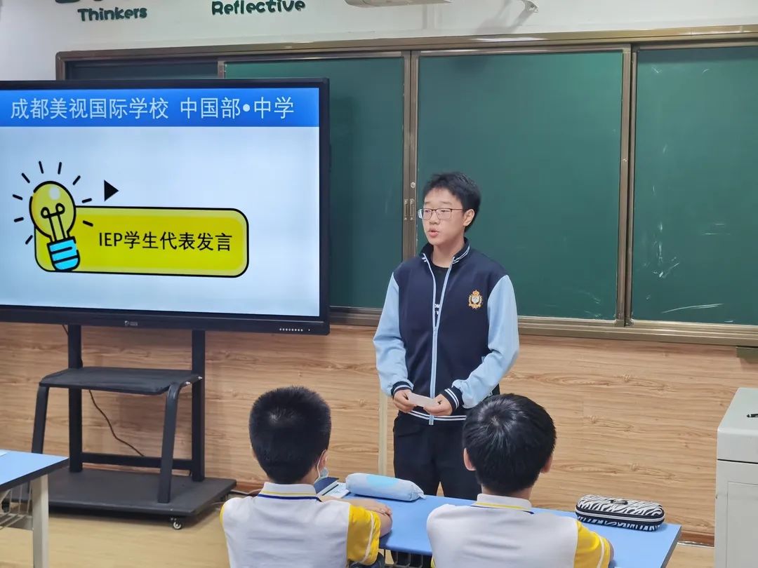 來自IEP項(xiàng)目的初二學(xué)長(zhǎng)則在發(fā)言中向?qū)W弟學(xué)妹們展示了自己豐富多彩的中學(xué)生活:研學(xué)周時(shí),在交流與實(shí)踐中學(xué)習(xí)新知識(shí);運(yùn)動(dòng)會(huì)中,揮灑汗水勇攀高峰;五月歌會(huì)上,用歌聲展示自我……雖然學(xué)習(xí)任務(wù)相較于小學(xué)時(shí)有所加重,但美視一直提倡同學(xué)們?nèi)姘l(fā)展,時(shí)刻不忘為大家搭建各式舞臺(tái)。最后,他告訴同學(xué)自己的經(jīng)驗(yàn),到了中學(xué)大家的學(xué)習(xí)態(tài)度、行為準(zhǔn)則和對(duì)自我的要求也應(yīng)該更上一個(gè)層次,不過最重要的還是保持自己的那顆初心和無限奮斗的勇氣。