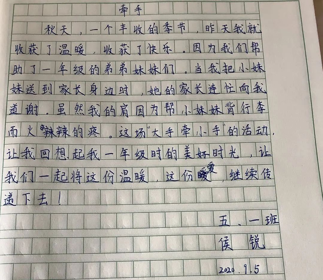 這次“大手牽小手”活動我感覺我從別人幫助我漸漸轉(zhuǎn)變成了我?guī)椭鷦e人。牽著一年級小朋友的小手時我覺得自己長大了。當他用稚嫩的聲音給我說謝謝時,我頓時感到心中暖暖的。