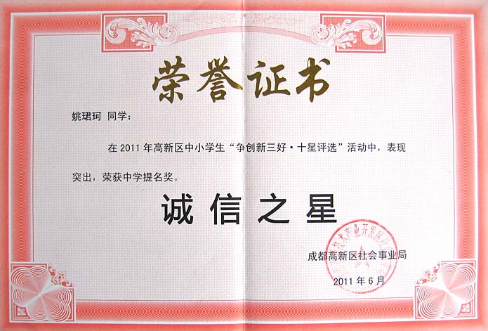 中學(xué)部姚珺珂同學(xué)在高新區(qū)“爭(zhēng)創(chuàng)新三好.十星評(píng)選”活動(dòng)中榮獲誠信之星稱號(hào)