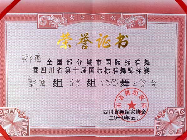 榮獲全國(guó)部分城市國(guó)際標(biāo)準(zhǔn)舞暨四川省第十屆國(guó)際標(biāo)準(zhǔn)舞錦標(biāo)賽新苗組倫巴舞三等獎(jiǎng)