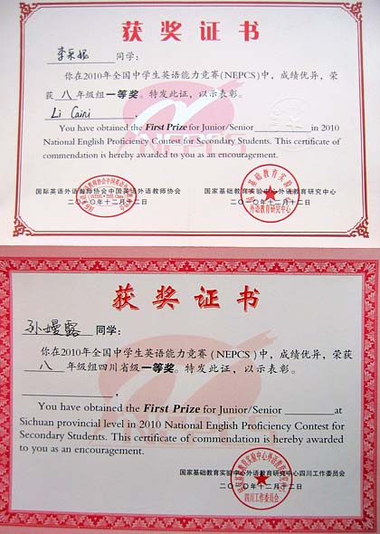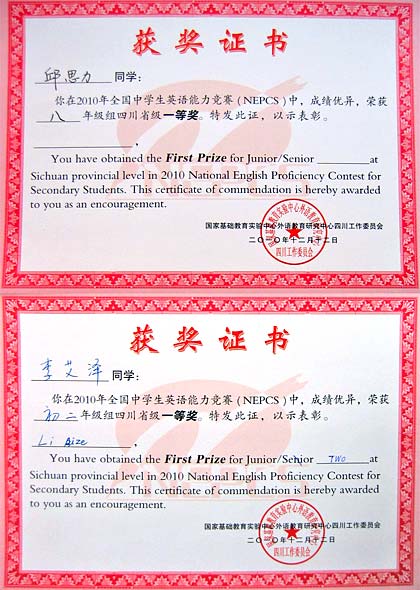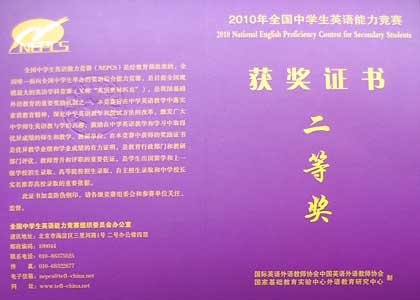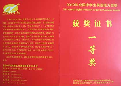 美視學(xué)子在2010年全國(guó)中學(xué)生英語(yǔ)能力競(jìng)賽(NEPCS)中獲獎(jiǎng)