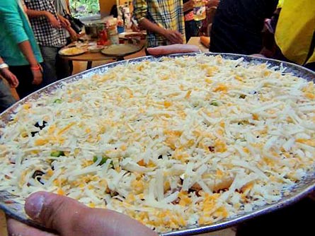 第三步:放材料。往比薩上撒了兩罐如番茄汗的不明液體,然后就開始放菜,其中最好玩的就是削起司,一塊磚頭大小,使勁削呀削,一個(gè)人拿不住,兩個(gè)人合作弄,我們削了一大盤起司,整個(gè)比薩上全是起司。
