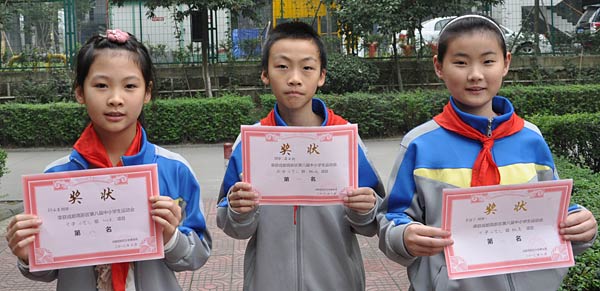 ▲ 柯雨萱、蔣雨橋、羅梓寧同學(xué)-榮獲成都市高新區(qū)第八屆中小學(xué)生運動會女子小乙組實心球比賽第八名