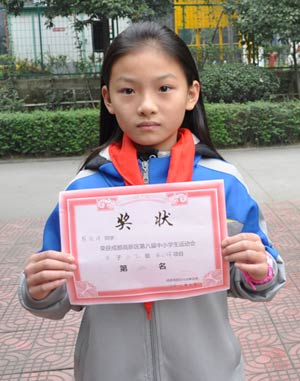 ▲ 陳浩洋同學(xué)-榮獲成都市高新區(qū)第八屆中小學(xué)生運動會女子小乙組實心球比賽第二名