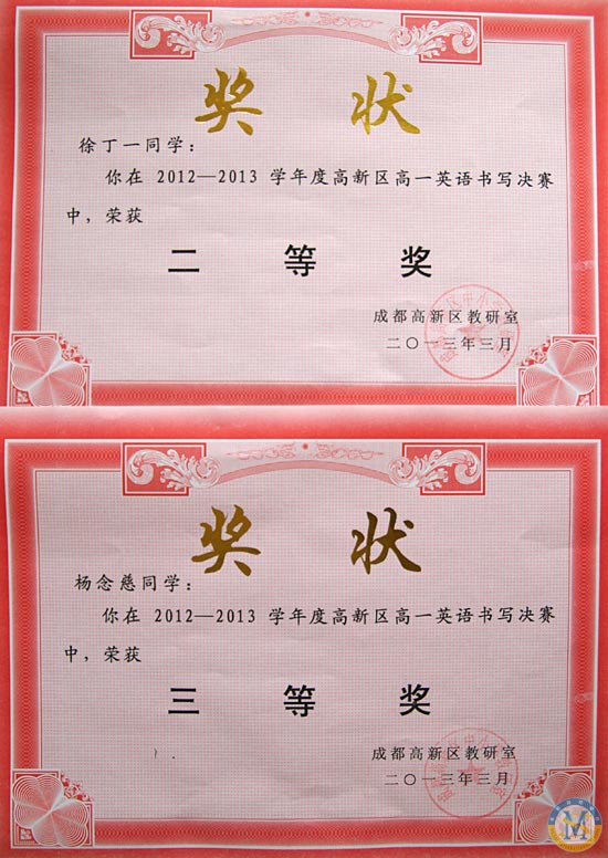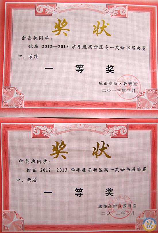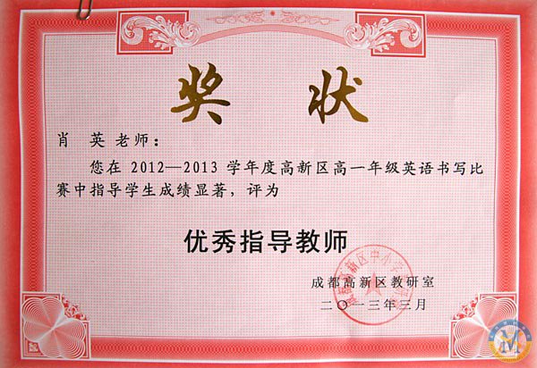 祝賀肖英老師指導(dǎo)我校高一學(xué)生在高新區(qū)英語書寫比賽中取得佳績