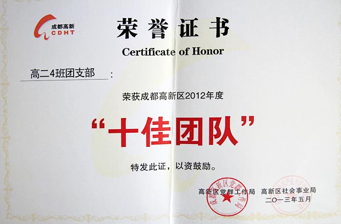 祝賀高二4班團(tuán)支部榮獲高新區(qū)“十佳團(tuán)隊(duì)”
