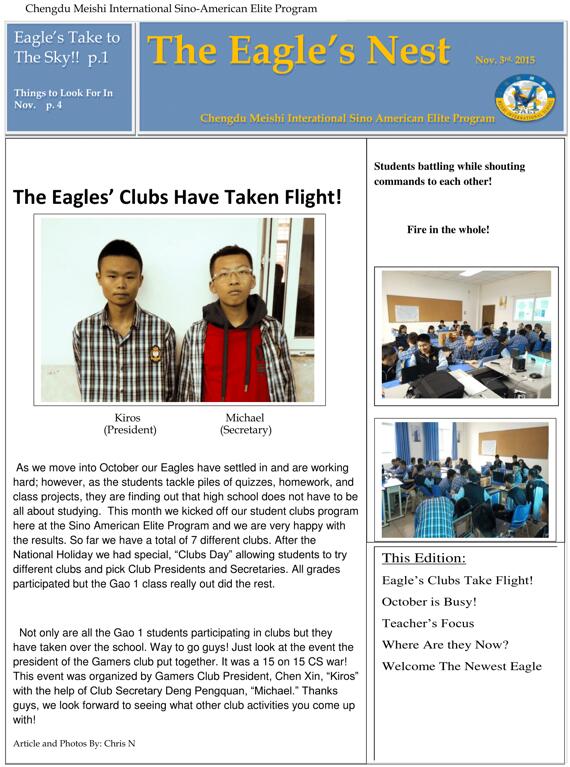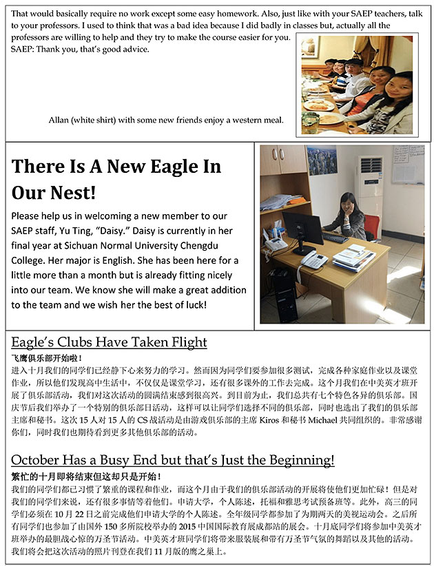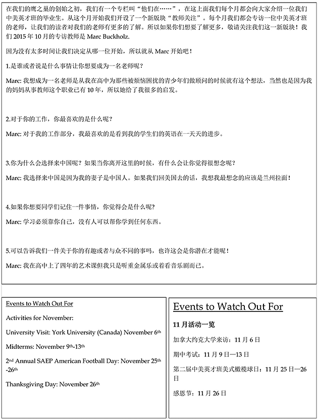 我們的同學(xué)們都已習(xí)慣了繁重的課程和作業(yè),而這個月由于我們的俱樂部活動的開展將使他們更加忙碌!但是對我們的同學(xué)們來說,還有很多事情等著他們。申請大學(xué),個人陳述,托福和雅思考試預(yù)備班等。此外,高三的同學(xué)們必須在1022日之前完成他們申請大學(xué)的個人陳述。全年級同學(xué)都參加了為期兩天的美視運動會。之后所有同學(xué)們也參加了由國外150多所院校舉辦的2015中國國際教育展成都站的展會。十月底同學(xué)們將參加中美英才班舉辦的最膽戰(zhàn)心驚的萬圣節(jié)活動。中美英才班同學(xué)們將帶來服裝展和帶有萬圣節(jié)氣氛的舞蹈以及其他的活動。我們將會把這次活動的照片刊登在我們11月版的鷹之巢上。