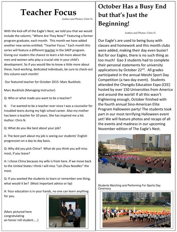 在我們的鷹之巢的創(chuàng)始之初,我們有一個專欄叫“他們在……”,在這上面我們每個月都會向大家介紹一位我們中美英才班的畢業(yè)生。從這個月開始我們開設(shè)了一個新版塊“教師關(guān)注”。每個月我們都會專訪一位中美英才班的老師,讓我們的讀者對我們的老師有更多的了解。所以如果你們想要了解更多,敬請關(guān)注我們這一新版塊!我們201510月的專訪教師是Marc Buckholz.
