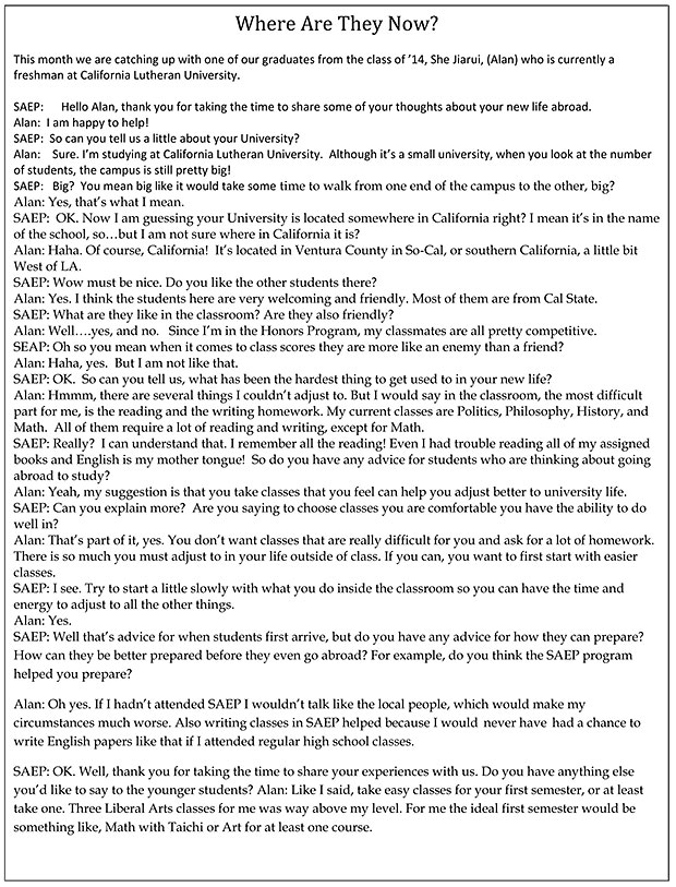Alan: 有?。∪绻覜]有參加中美英才班,我就不會像當(dāng)?shù)厝艘粯咏涣鳎@樣的話會讓我的處境更加糟糕。中美英才班的寫作課對我也很有幫助,因為如果我讀的是普通高中,我也不會有機(jī)會寫英語論文。