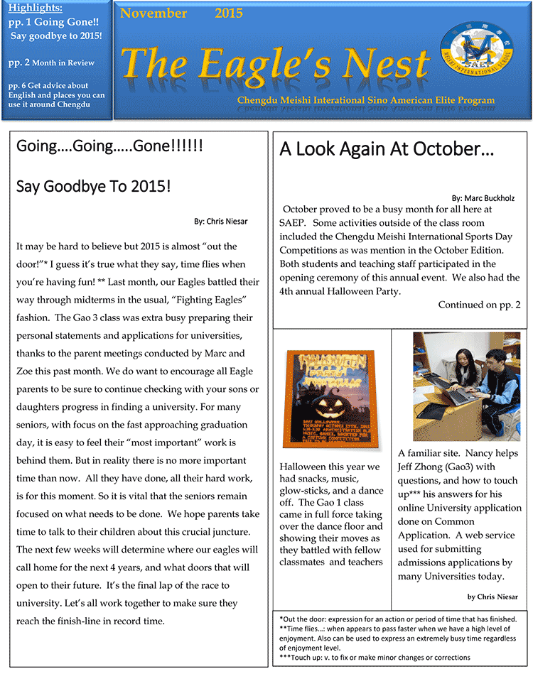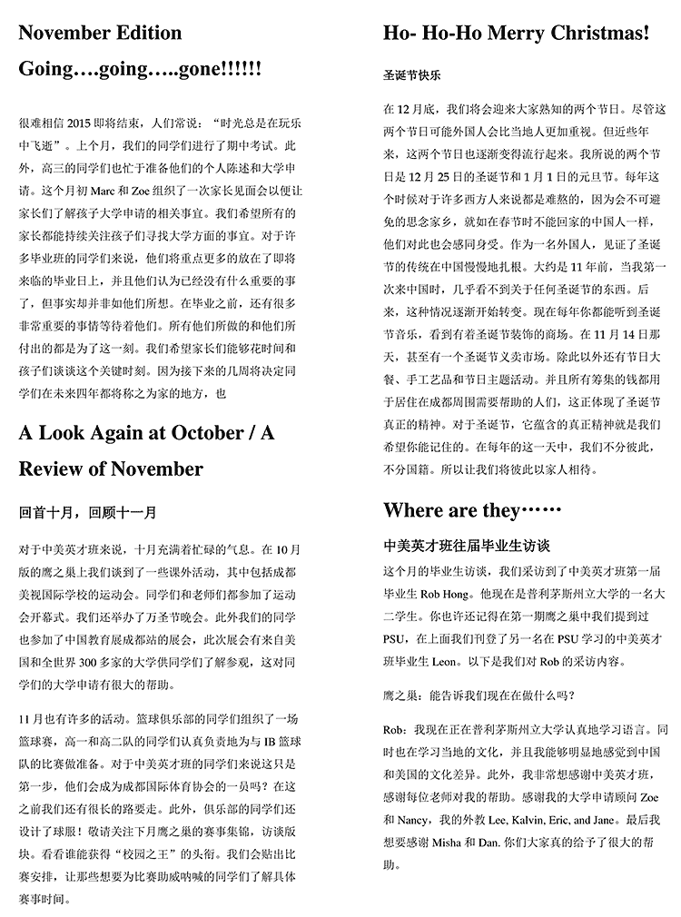 很難相信2015即將結(jié)束,人們常說:“時光總是在玩樂中飛逝”。上個月,我們的同學們進行了期中考試。此外,高三的同學們也忙于準備他們的個人陳述和大學申請。這個月初MarcZoe組織了一次家長見面會以便讓家長們了解孩子大學申請的相關(guān)事宜。我們希望所有的家長都能持續(xù)關(guān)注孩子們尋找大學方面的事宜。對于許多畢業(yè)班的同學們來說,他們將重點更多的放在了即將來臨的畢業(yè)日上,并且他們認為已經(jīng)沒有什么重要的事了,但事實卻并非如他們所想。在畢業(yè)之前,還有很多非常重要的事情等待著他們。所有他們所做的和他們所付出的都是為了這一刻。我們希望家長們能夠花時間和孩子們談?wù)勥@個關(guān)鍵時刻。因為接下來的幾周將決定同學們在未來四年都將稱為家的地方,也將決定開啟怎樣的未來之門。這是邁向大學的最后沖刺,讓我們齊心協(xié)力確保他們能在有限的時間里快速地完成他們的大學申請。
