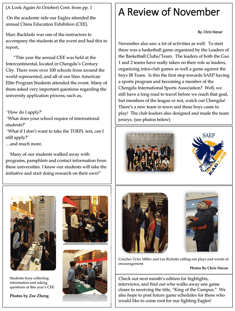 11月也有許多的活動?;@球俱樂部的同學們組織了一場籃球賽,高一和高二隊的同學們認真負責地為與IB籃球隊的比賽做準備。對于中美英才班的同學們來說這只是第一步,他們會成為成都國際體育協(xié)會的一員嗎?在這之前我們還有很長的路要走。此外,俱樂部的同學們還設(shè)計了球服!