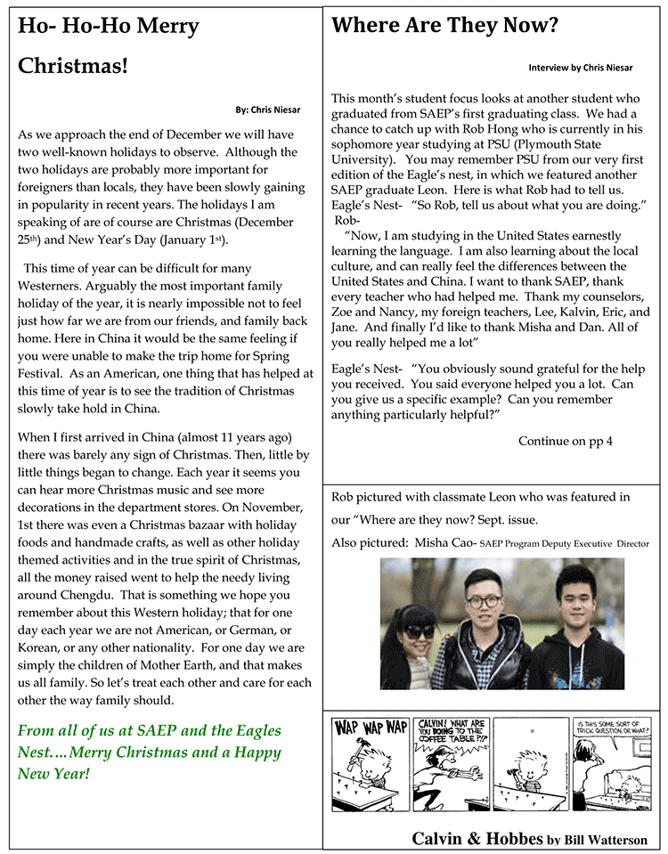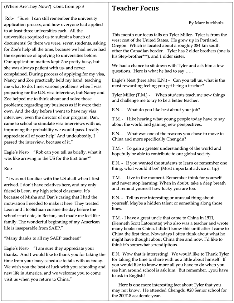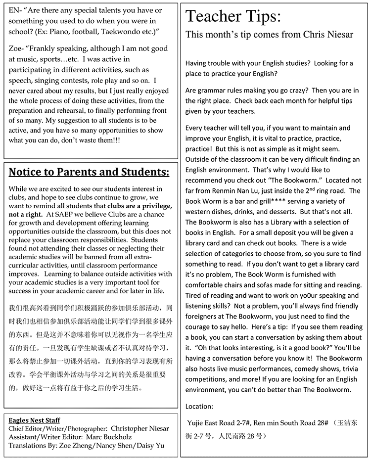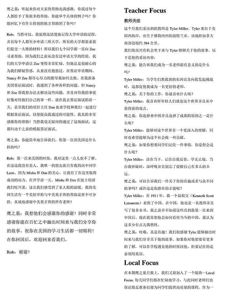 鷹之巢:哇哦,真是有趣!我們很感謝Tyler能夠抽出時間來與我們分享關(guān)于他的故事。如果你對他想要有更多的了解,可以在學校遇見他的時候問他,但要記住的是必須用英語。