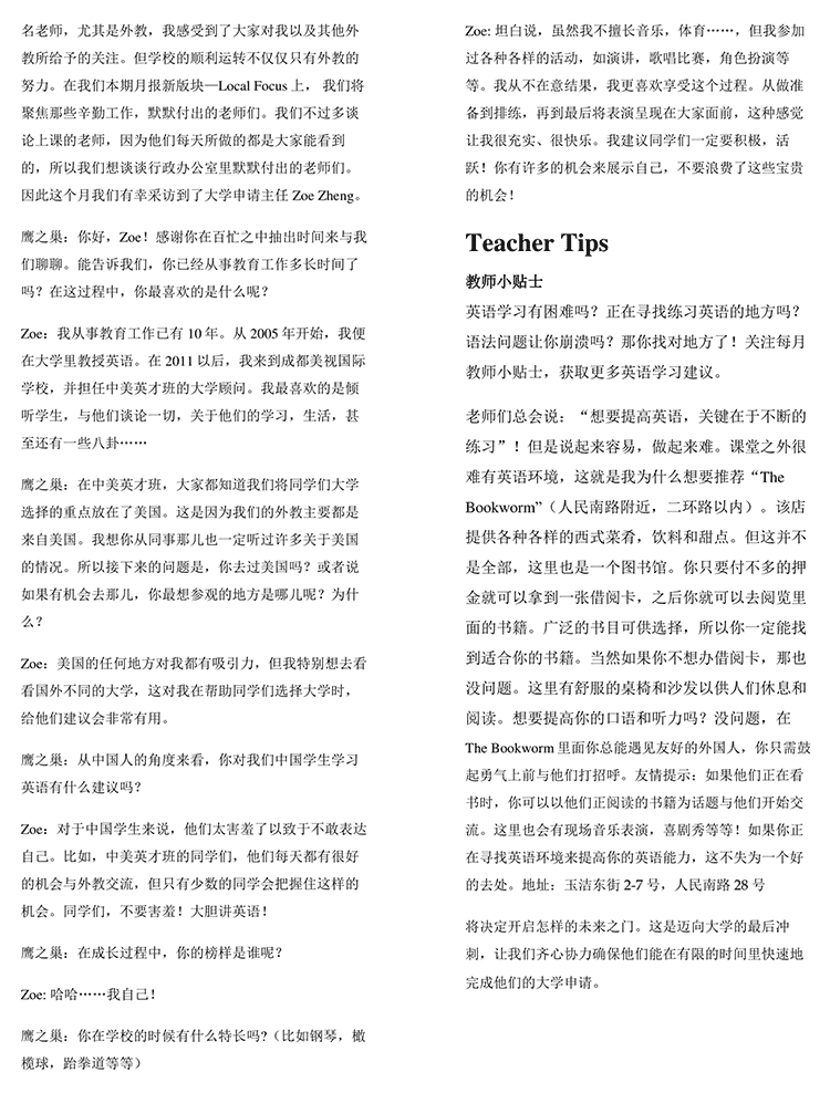 在本期鷹之巢月報上,我們又新加入了一個版塊—Local Focus. 每天同學們都在忙碌地學習,與此同時老師們也保證做足準備以便為同學們提供高質(zhì)量的課程。作為一名老師,尤其是外教,我感受到了大家對我以及其他外教所給予的關(guān)注。但學校的順利運轉(zhuǎn)不僅僅只有外教的努力。在我們本期月報新版塊—Local Focus上, 我們將聚焦那些辛勤工作,默默付出的老師們。我們不過多談?wù)撋险n的老師,因為他們每天所做的都是大家能看到的,所以我們想談?wù)勑姓k公室里默默付出的老師們。因此這個月我們有幸采訪到了大學申請主任Zoe Zheng