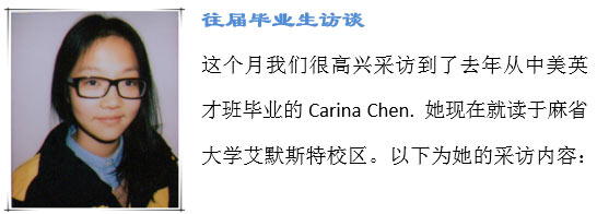Carina:  我可以很肯定地說我在中美英才班所學(xué)到的讓我現(xiàn)在能夠流利且自信地講英語,至少在一定程度上是這樣的。講英語的時候,我也從來沒有感覺到很緊張。