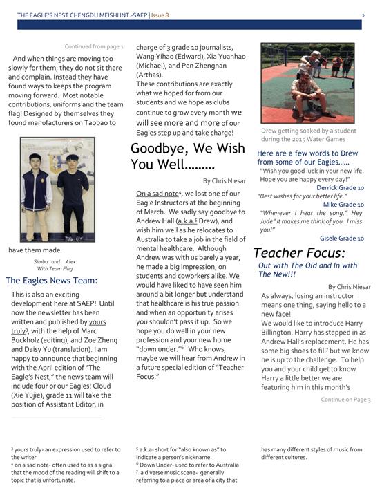 這又是一件令人興奮的事! 很高興地向大家宣布從四月版的鷹之巢月報(bào)開始,將會(huì)由四位同學(xué)共同參與月報(bào)的編輯工作。他們分別是來自高二年級(jí)的Cloud(謝鈺杰)和來自高一的Edward(王一灝),Michael(夏源毫)和Arthas(裴正楠)三位同學(xué)。Cloud擔(dān)任助理編輯,其他三位同學(xué)分別擔(dān)任記者。