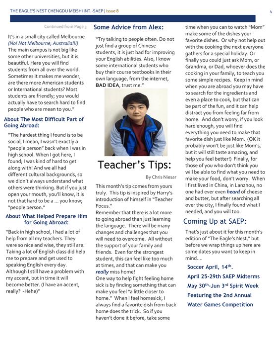Alex: 多與他人交流。不要只與中國學(xué)生交流,這對(duì)于提高你的英語能力是不利的。據(jù)我了解,有些國際生在網(wǎng)上買自己國家語言版本的教材。相信我,這絕對(duì)是一個(gè)不明智的做法。