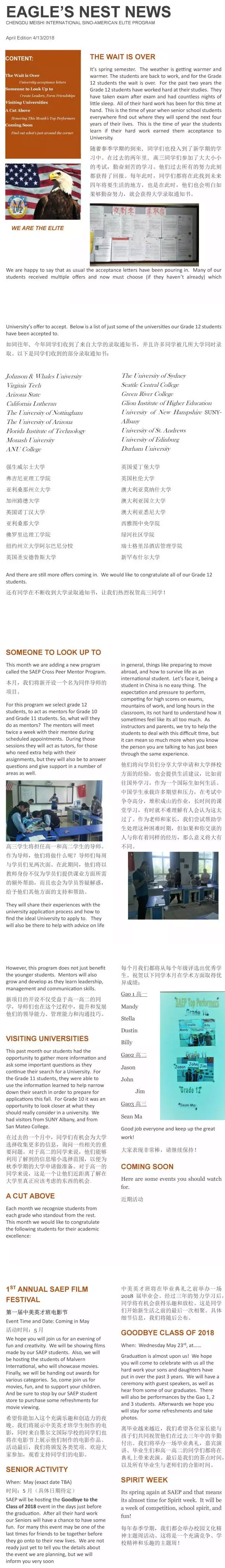 隨著春季學期的到來,同學們也投入到了新學期的學習中。本期月報,我們將帶你走進中美英才班的學習生活、趣事、活動——大學錄取信、同伴導師輔導活動、大學來訪、近期活動。